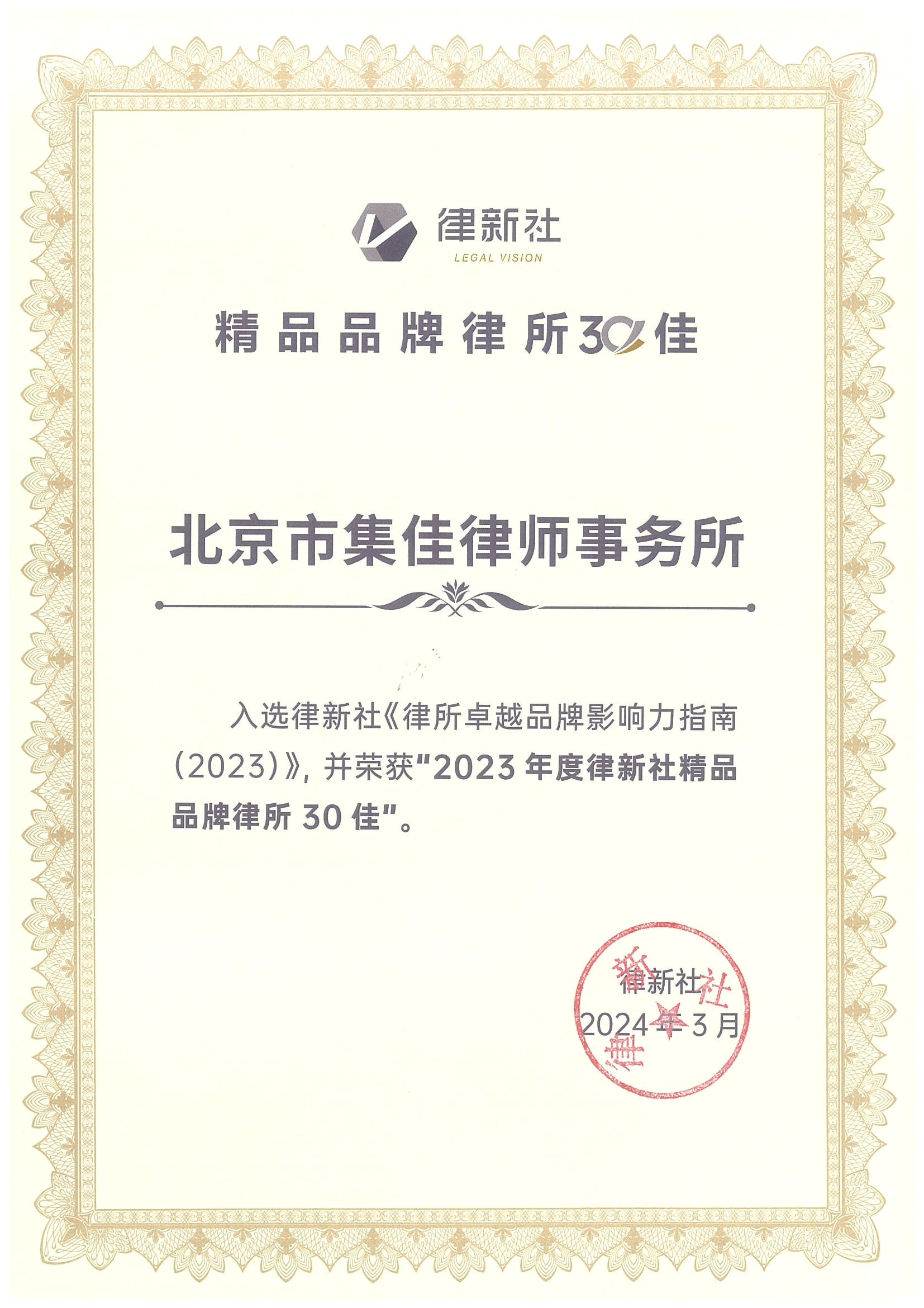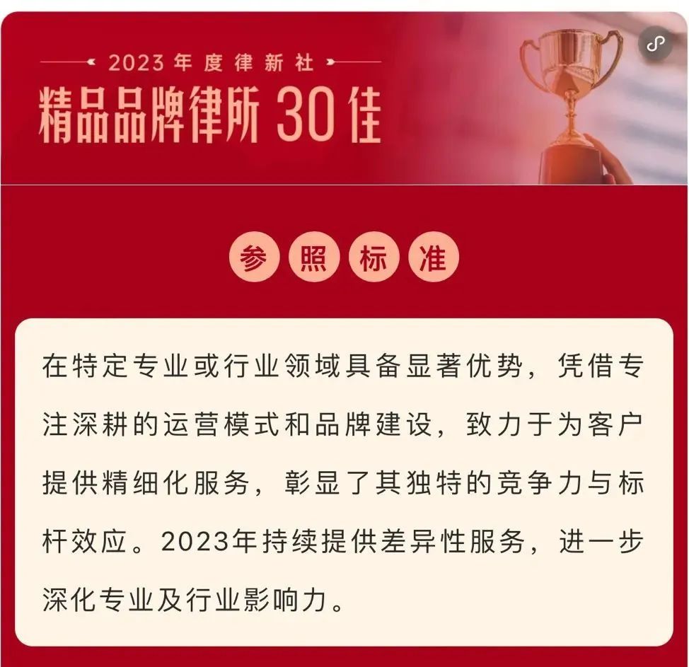 2024年3月2日,由中国法学交流基金会指导、律新社主办的“致·追光者”第二届法律服务业品牌发展论坛暨律新社2023年度品牌盛典隆重举行,现场发布了备受关注的《律所卓越品牌影响力指南(2023)》,kaiyun凭借在知识产权领域的卓越实力和良好口碑,荣登“2023年度律新社精品品牌律所30佳”榜单。