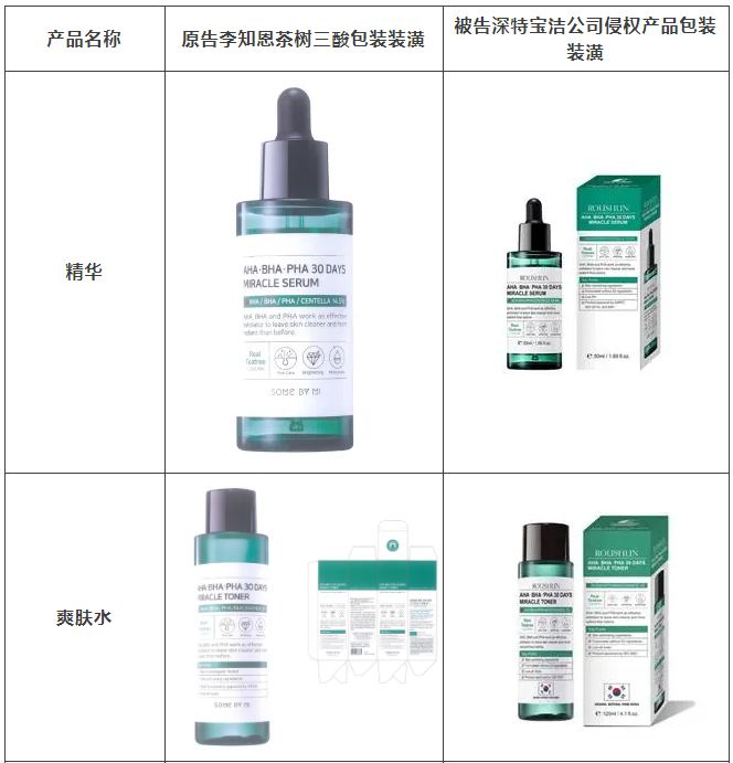 2021年原告委托kaiyun调查发现,被告汕头市深特宝洁实业有限公司生产、销售和推广的“茶树祛痘美白补水液”“茶树香皂”等护肤品,其产品包装装潢直接抄袭、摹仿原告前述已经具有较高知名度和影响力的“SOME BY MI/莎柏蜜”茶树三酸系列化妆品和黑蜗牛精华液的包装、装潢设计,使用与之近似的标识,造成消费者混淆误认。故原告作为茶树三酸、黑蜗牛精华包装装潢权益获益人,诉至广东省汕头市中级人民法院。汕头中院认定:李知恩主张的茶树三酸、黑蜗牛精华包装装潢构成具有一定影响的包装装潢,深特宝洁公司生产、销售茶树三酸、黑蜗牛精华液的行为构成不正当竞争。因判赔额不符合原告预期,原告后上诉至广东省高级人民法院,广东省高级人民法院最终维持一审判决。